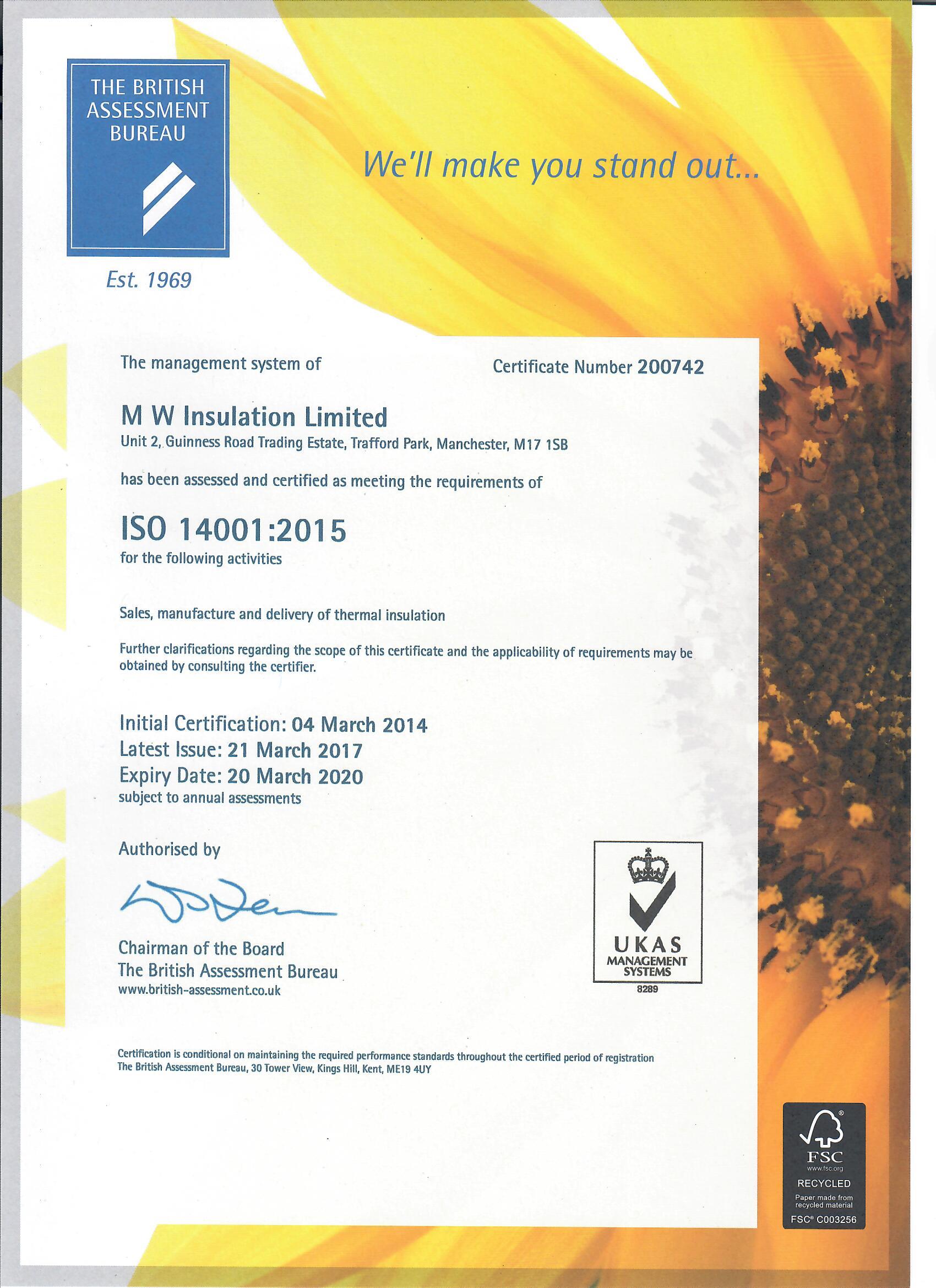 A copy of the MW Insulation’s ISO 14001:2015 UKAS Management System certificate from The British Assessment Bureau can be found here.